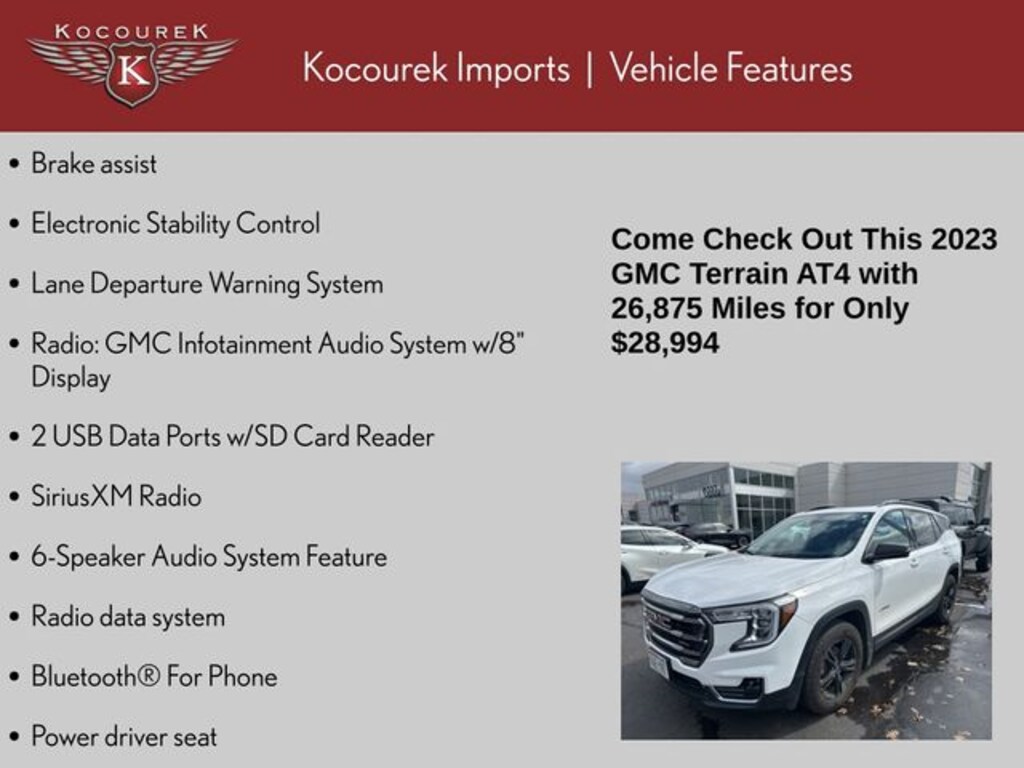 Whether you're tackling the daily commute or embarking on a weekend adventure, the 2023 GMC Terrain AT4 is the perfect companion. Experience the perfect blend of capability, technology, and style. Please call one of our knowledgeable Sales Consultants with any question you might have. Serving guests in Marathon, Portage, Langlade, Oneida, Taylor, Vilias, Wood, Clark, Lincoln, Waupaca, Northwoods, Sales Event always happening near me. Price & Inventory may change without notice, please call to verify!