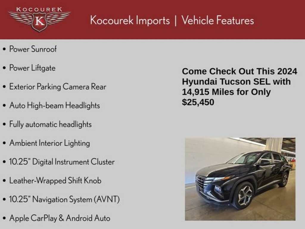 Tucson SEL, 4D Sport Utility, 2.5L I4 DGI DOHC 16V LEV3-SULEV30 187hp, 8-Speed Automatic with SHIFTRONIC, AWD, Black Pearl, Gray Cloth, 10.25" Digital Instrument Cluster, 10.25" Navigation System (AVNT), Ambient Interior Lighting, Apple CarPlay & Android Auto, Auto High-beam Headlights, Exterior Parking Camera Rear, Fully automatic headlights, H-Tex Seat Trim, Heated Front Bucket Seats, Heated front seats, Leather-Wrapped Shift Knob, Power Liftgate, Power Sunroof, Split folding rear seat, Stain & Odor Resistant Cloth Seat Trim.