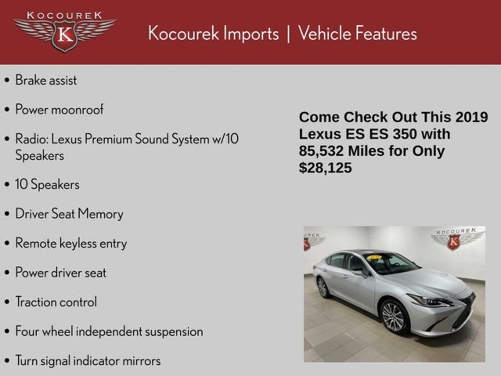ES 350, 4D Sedan, 3.5L V6 DOHC Dual VVT-i 24V, 8-Speed Automatic, FWD, 10 Speakers, 10-Way Power Adjustable Front Seats, Brake assist, Driver Seat Memory, Four wheel independent suspension, Front Bucket Seats, Heated & Ventilated Seats, Illuminated entry, NuLuxe Seat Trim, Power driver seat, Power moonroof, Power passenger seat, Radio: Lexus Premium Sound System w/10 Speakers, Rain Sensing Wipers, Remote keyless entry, Traction control, Turn signal indicator mirrors, Wheels: 17" x 7.5J Split 10-Spoke Aluminum Alloy, 4-Wheel Disc Brakes, ABS brakes, Air Conditioning, Alloy wheels, AM/FM radio: SiriusXM, Auto High-beam Headlights, Auto-dimming door mirrors, Automatic temperature control, Bumpers: body-color, CD player, Compass, Delay-off headlights, Driver door bin, Driver vanity mirror, Dual front impact airbags, Dual front side impact airbags, Electronic Stability Control, Emergency communication system: Lexus Enform w/Safety Connect, Exterior Parking Camera Rear, Front anti-roll bar, Front Center Armrest, Front dual zone A/C, Front reading lights, Fully automatic headlights, Garage door transmitter: HomeLink, Knee airbag, Leather Shift Knob, Leather steering wheel, Low tire pressure warning, Occupant sensing airbag, Outside temperature display, Overhead airbag, Overhead console, Panic alarm, Passenger door bin, Passenger vanity mirror, Power door mirrors, Power steering, Power Tilt/Telescoping Steering Wheel w/Memory, Power windows, Radio data system, Rear anti-roll bar, Rear reading lights, Rear seat center armrest, Rear side impact airbag, Rear window defroster, Security system, Speed control, Speed-sensing steering, Steering wheel mounted audio controls, Tachometer, Telescoping steering wheel, Tilt steering wheel, Trip computer, Variably intermittent wipers, ES 350, 4D Sedan, 3.5L V6 DOHC Dual VVT-i 24V, 8-Speed Automatic, FWD, 10 Speakers, 10-Way Power Adjustable Front Seats, Brake assist, Driver Seat Memory, Four wheel independent suspension, Front Bucket Seats, Heated & Ventilated Seats, Illuminated entry, NuLuxe Seat Trim, Power driver seat, Power moonroof, Power passenger seat, Radio: Lexus Premium Sound System w/10 Speakers, Rain Sensing Wipers, Remote keyless entry, Traction control, Turn signal indicator mirrors, Wheels: 17" x 7.5J Split 10-Spoke Aluminum Alloy.